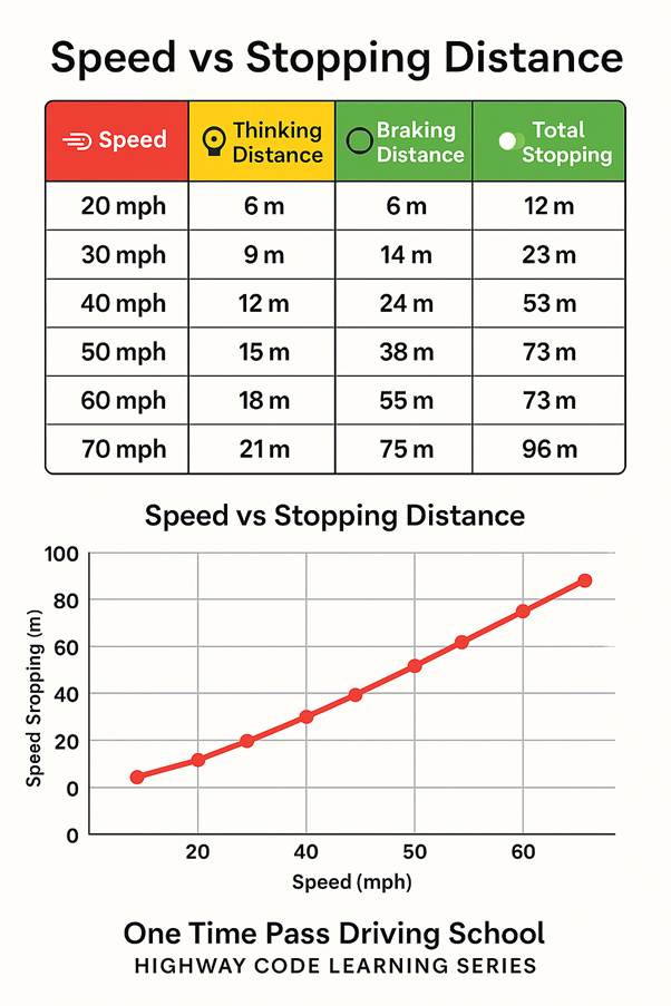 Below is a complete One Time Pass Driving School guide to Speed and Stopping Distance, including formulas, tables, graph, and safety principles.